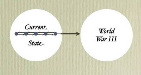 The circle on the left represents the current state of the world, while the one on the right represents the world after a full-scale nuclear war. Because World War III is a state of no return, there is no path back to our current state. Even though an arrow is shown to indicate the possibility of a transition from our current state to one of global war, that path seems impossible to most people. How could we possibly transit from the current, relatively peaceful state of the world to World War III? The answer lies in recognizing that what is depicted as a single, current state of the world is much more complex. Because that single state encompasses all conditions short of World War III, as depicted below, it is really composed of a number of substates – world situations short of World War III, with varying degrees of risk: